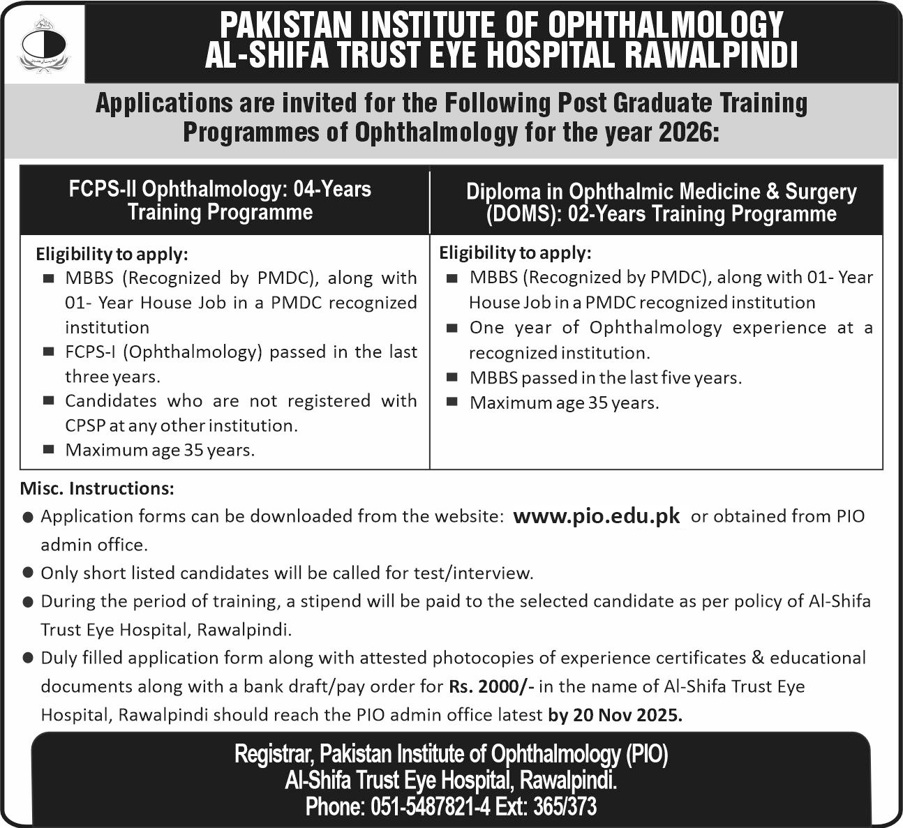 Applications are invited for FCPS-II Ophthalmology & Diploma in Ophthalmic Medicine & Surgery (DOMS)